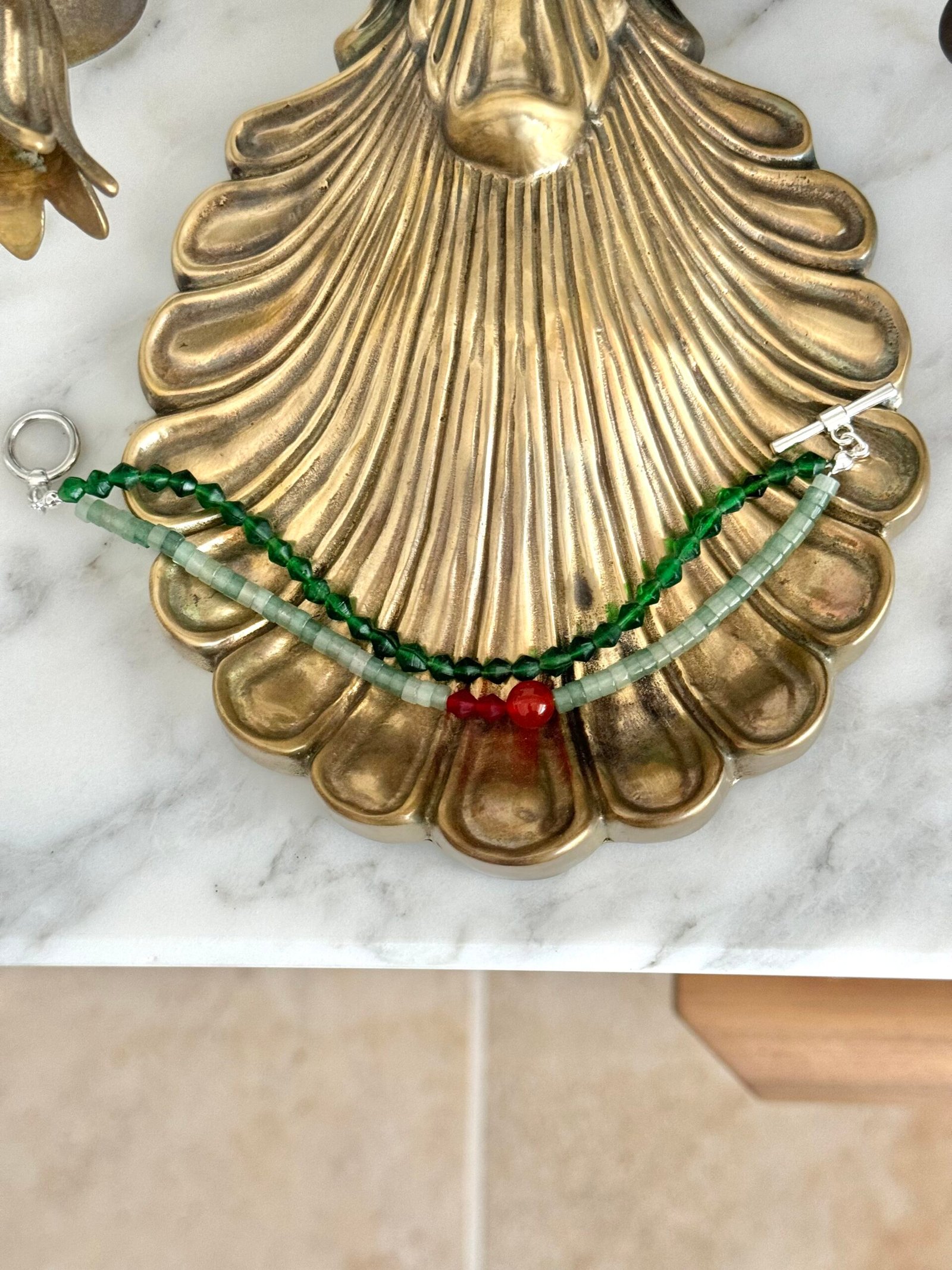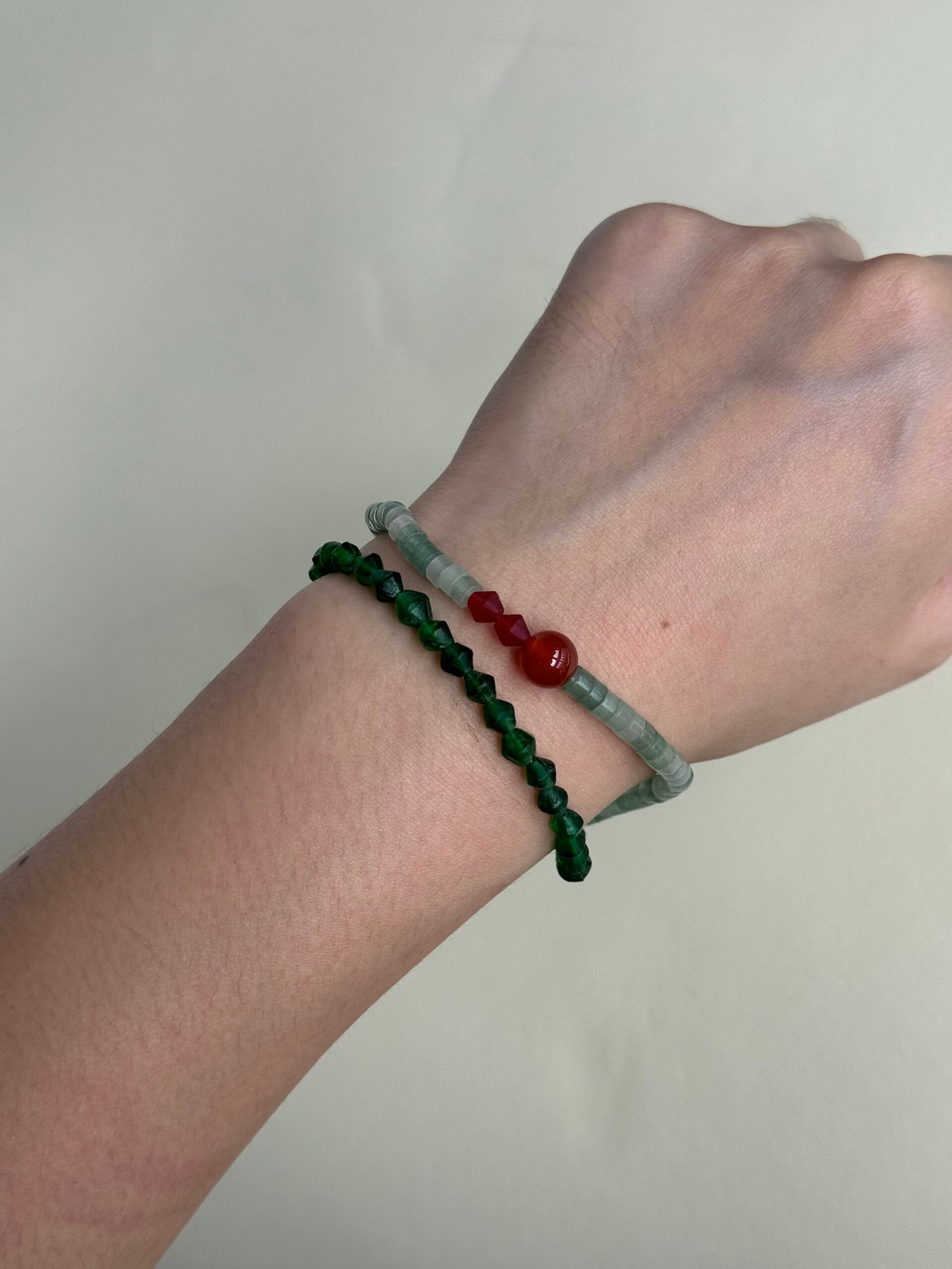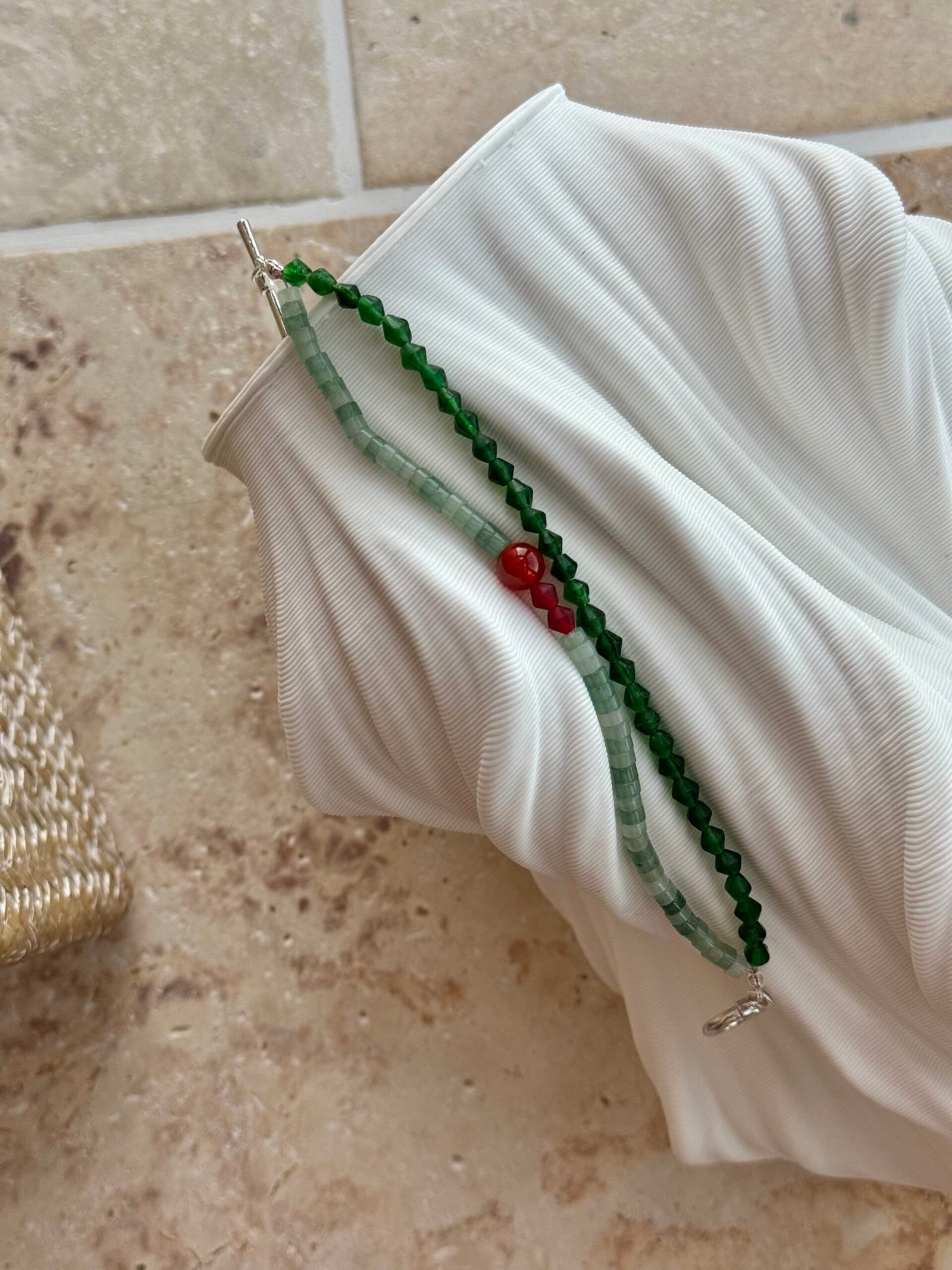 Inspired by the fusion of ethnic craftsmanship and the allure of natural gemstones, this bracelet draws its creativity from traditional Nepalese craftsmanship, with rhombus glass beads showcasing exquisite detailing. Adopting a dual-strand design, it combines the geometric charm of Nepalese rhombus glass beads, the understated elegance of green aventurine discs, and the vivid accent of red agate, creating a layered visual effect. The unique combination of materials not only highlights the distinct textures and colors but also presents a versatile style that can effortlessly switch between Eastern mystery and everyday elegance.